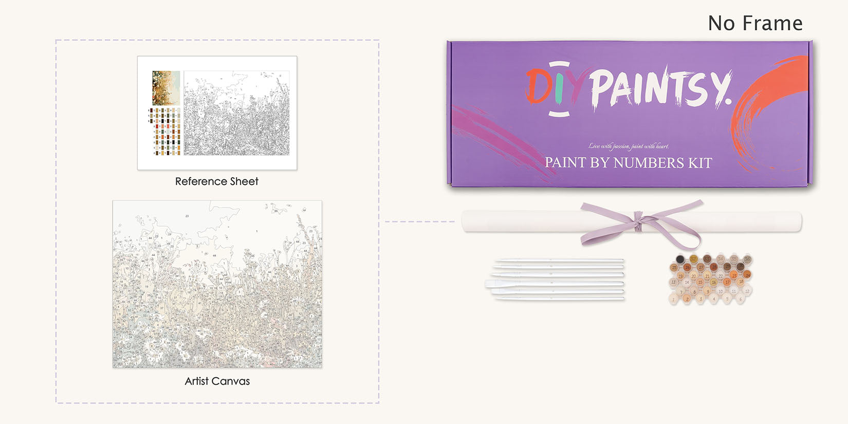 - Frame – Complete paint by numbers kit, including rolled canvas and DIY wooden frame.